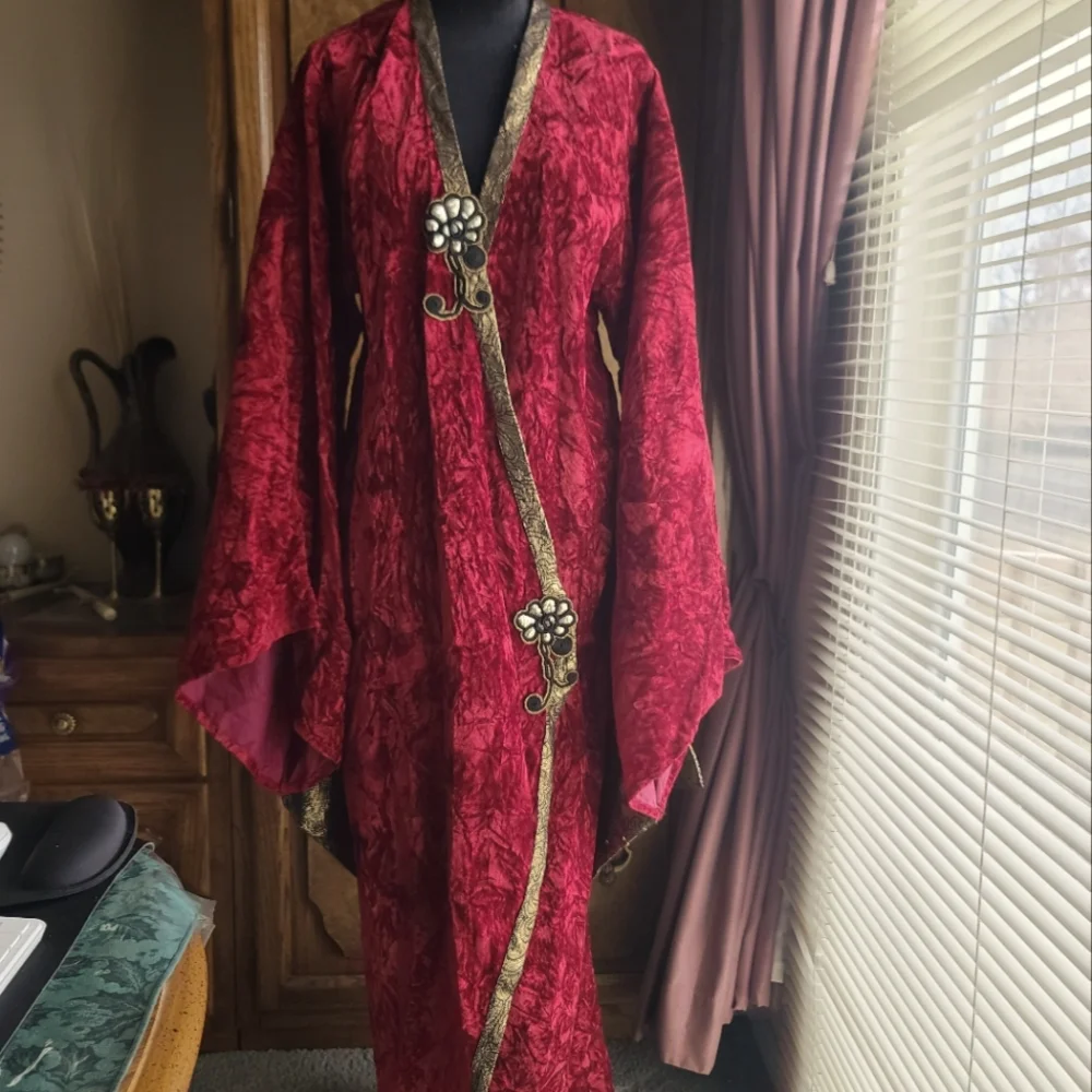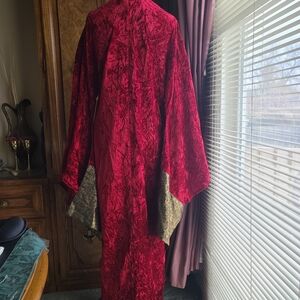 Maroon velvet feel robe trimmed in gold & black with inner waist tie, two slide closures with a push button snap.