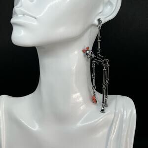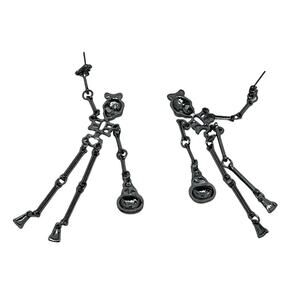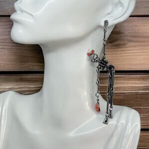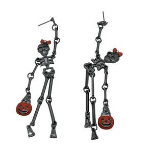 These striking dangle earrings feature a gothic, skeleton-inspired design with a playful pumpkin accent. Crafted from black metal, the earrings measure approximately 9.5 cm in length.