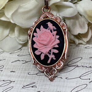 Gothic Steampunk Halloween Rose Gold Necklace Black Pink Rose Cameo Jewelry