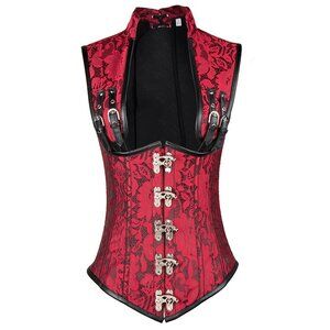 Step into elegance and rebellion with this Gothic Steampunk Corset! Featuring a striking red lace overlay on black, this structured corset is designed to enhance your hourglass silhouette while providing a dramatic burlesque or Victorian-inspired look. The high-neck halter design with adjustable buckle straps and front metal clasps adds a bold, edgy touch. Perfect for cosplay, gothic fashion, steampunk events, burlesque performances, or waist training.