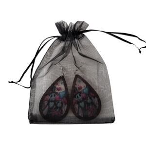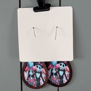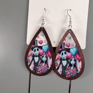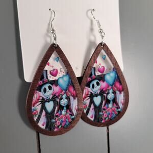 Wooden teardrop dangle earrings with a Jack & Sally-style gothic design. Measures approx. 3.25" long. Hook closure for pierced ears. Lightweight and bold.