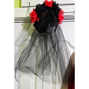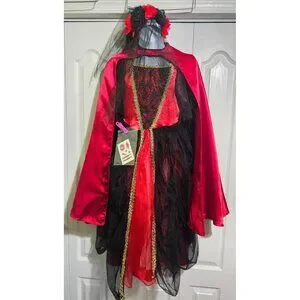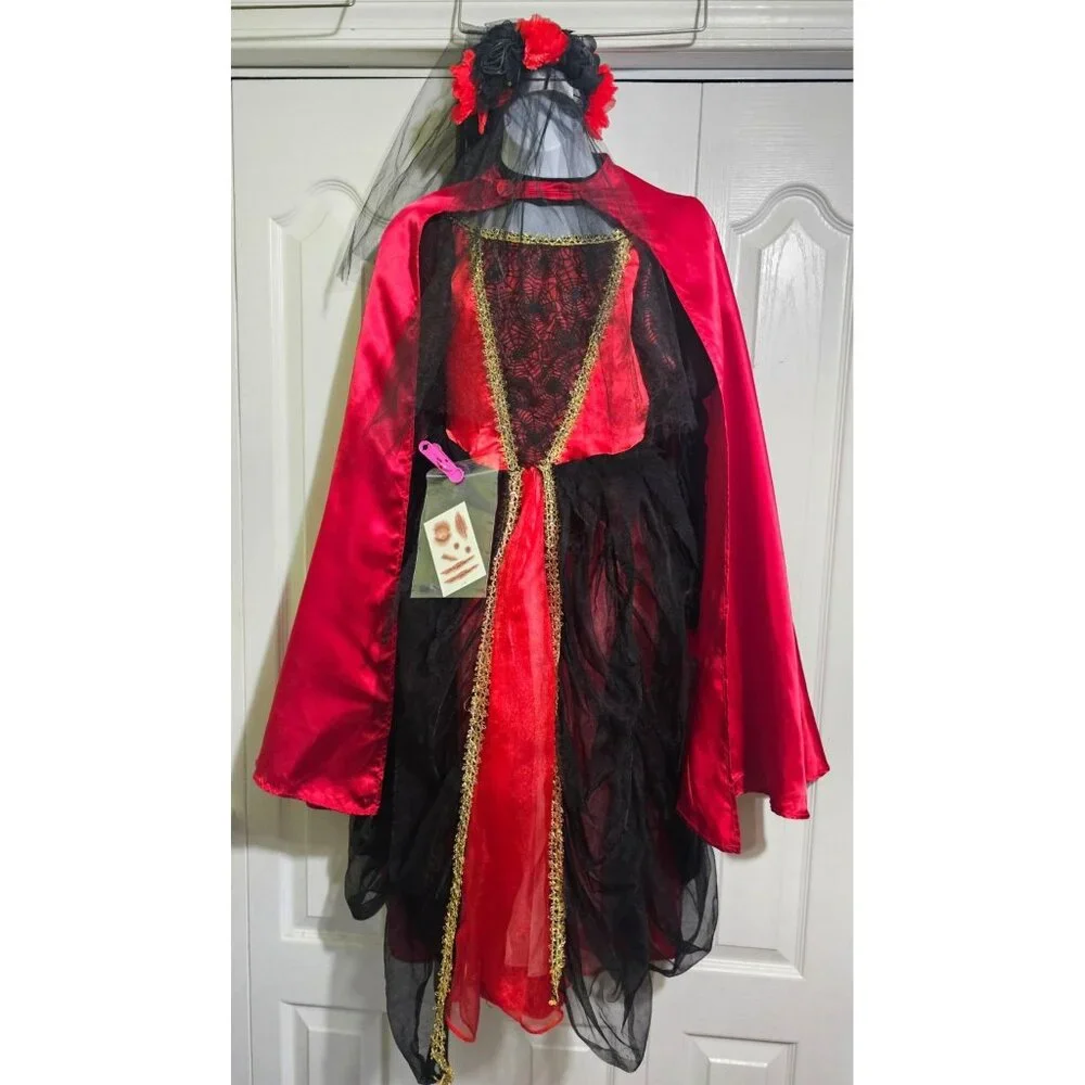 Gothic Vampire Bride Costume Girls 8-10 Red Spider Dress Veil Cape Halloween