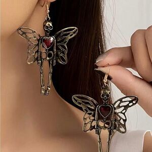 Gorgeous Unique Vintage Inspired Antique Gold Tone Skelton Fairy Dangling Earrings. Engraved details and amazing design with red stone heart on each one. Perfect for a year round spooky lover.