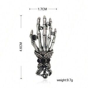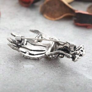 Gorgeous Gothic Silver tone Skeleton Hand Brooch with beautiful sparkling faux jewel accent. Elegant Victorian design with stunning engraved shirt cuff. Lightweight and easy to use. Perfect little statement piece to add a little spooky to your outfit. 🖤