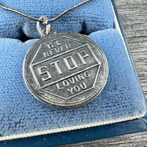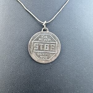 Sterling silver pendant necklace etched with “I’ll Never Stop Loving You” in bold stop-sign lettering. The piece carries a deep patina, giving it a moody, timeworn aura. Chain measures 16” with a 0.75” pendant. A rare vintage token of love and obsession— equal parts romantic and gothic.