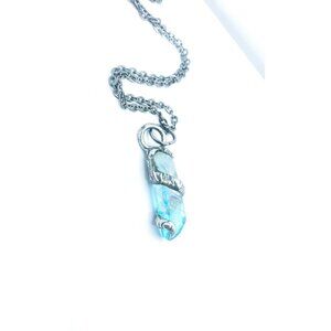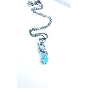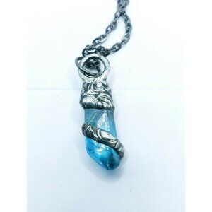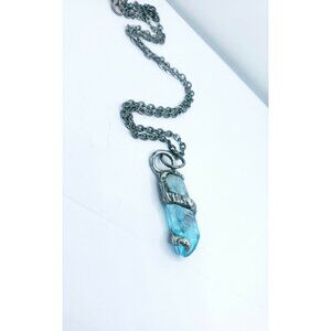 An amazing rainbow aqua aura titanium quartz crystal crafted into a beautiful renaissance / medieval pendant, hung from an 18" long gunmetal tone chain.
