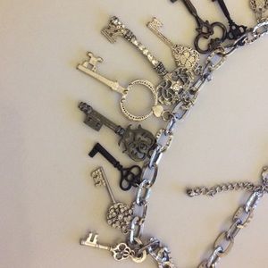 Beautiful key charms adorn this silver necklace. 11 key charms on this necklace and none of them are alike! Each has its own uniqueness & beauty. Some are black, some are a burnished silver. Trust me when I say this piece is a show stopper!