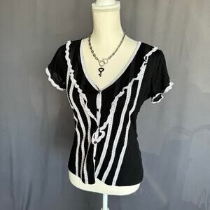 Button up style, has a v-neck and a lot of white lace accents. Such a beautiful top, I just don’t wear it anymore. In good preloved condition, no major flaws