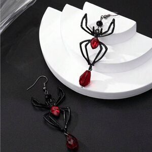 Gothic Earrings Black Widow Spider, Dangling with sparkling Red Ruby lig…