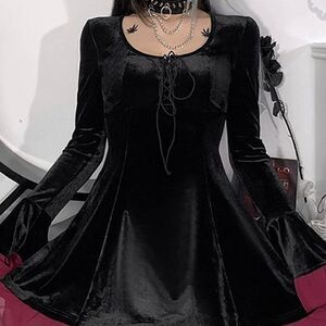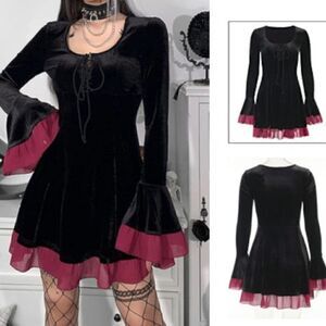 Gothic Lace-Up Retro Black Velvet Flare Long Sleeve Steampunk Dress NEW