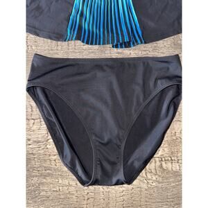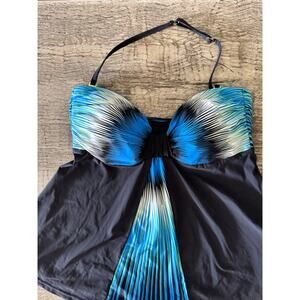 Eye catching Gottex Contour tankini set, size 6. Featuring a dramatic fanburst ombré design in rich blue, turquoise, and white tones, the flowy A-line top offers flattering coverage with a built-in bust for gentle support. Paired with solid black high-rise shaping bottoms, this suit blends fashion and function for a chic, sculpting silhouette.