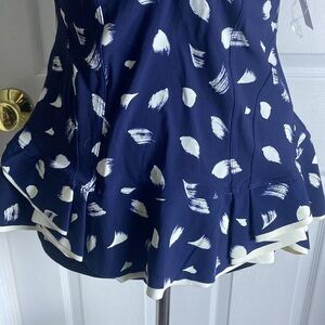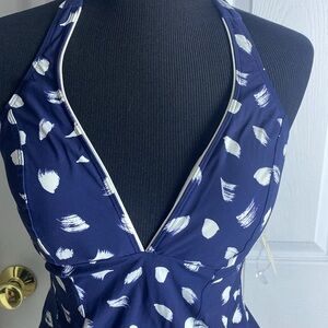 Gottex Halter Tankini top. Navy blue with white accents. Deep v-neck. Ruffle hem. Sz 12. NWT