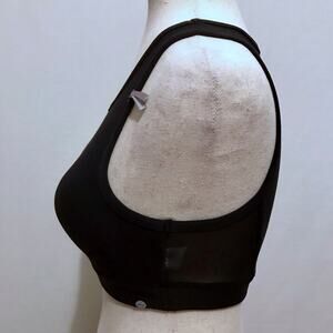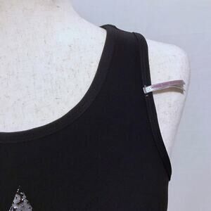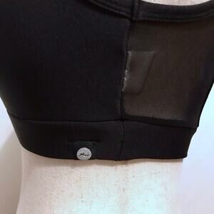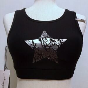 NWT. Black Sports bra for Women Size XS. Black with distressing Star graphic design front, sleeveless, elastic bottom hem, graphic brand logo bottom left and middle top back, mesh detail sides, removable padding, as per tags "control and support, moisture wicking". Pictures are part of description.