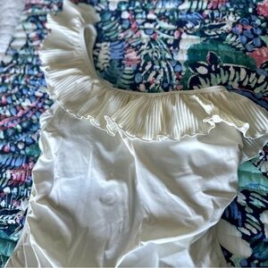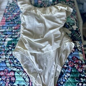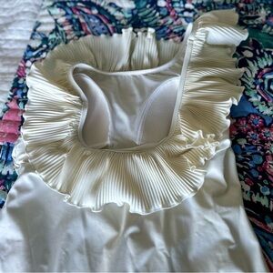 Elegant one piece bathing suit EUC. Flattering ruched bodice with a one shoulder ruffled strap.