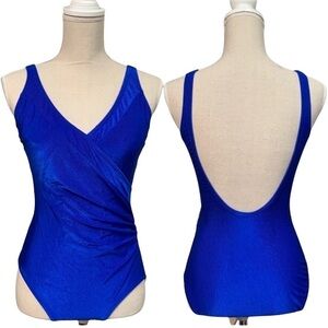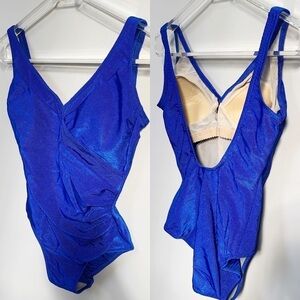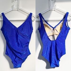 Cobalt blue ribbon textured surplice Profile by Gottex swimsuit. Crossover v-neck front; scoop back; soft cups; tummy control; adjustable straps; textured fabric. In excellent used condition.