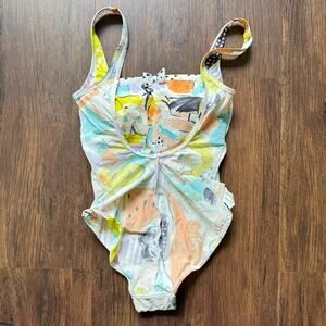 Rare vintage Gottex one-piece swimsuit featuring a playful, illustrative print in pastel tones. Made in Israel with an 80% polyamide / 20% Lycra blend that offers soft stretch and flattering support. Features a square neckline with bow detail, sexy open back, and moderate coverage—classic 1990s resortwear aesthetic.