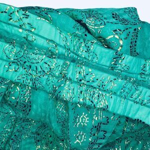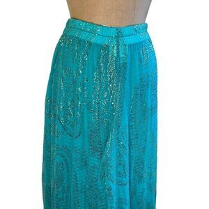 Gottex Vintage super Wide Leg Aqua and Gold Paisley Pattern pull on Pants or Divided skirt. fabric is a chiffon feel semi sheer and fully lined. Beautiful color and the gold appears painted on.they have a great swishy flow to them.