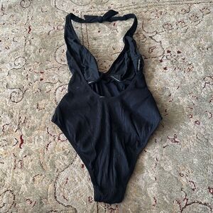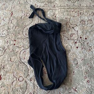Black one-piece with tie behind neck. Very good condition. Size 10.
