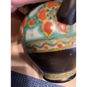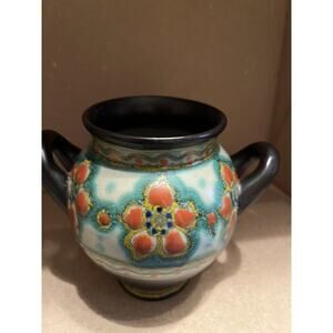 This vintage Gouda Holland Art Pottery vase features an Art Deco style with a vibrant blue and orange color scheme. Handmade in Holland, the ceramic vase has a unique pattern of flower petals in a all-over design. With a height and width of 8 inches, this original piece by Gouda Holland showcases intricate craftsmanship and a floral theme that enhances any floral or garden-themed decor. Perfect for collectors of vintage pottery, this double-handled vase adds a touch of artistic charm to any space.