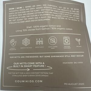 Protect your baby from scratches and keep them warm with this super-soft, innovative baby mitt. Features Goumi signature black and white pattern on the reverse side of mitt to boost brain development (0-6m) and two-part closure system with adjustable fit as they grow.