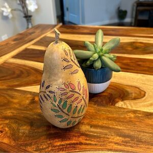 This is a recent art piece from my studio and made by me. It’s a gourd that I wood burned the vine design on and then painted the colors. It’s really satisfying texture and I love the way this came out. I hope someone wants to display it proudly in their home, that’s my favorite. It sits very flat on a table, and these are durable, so if you have little ones or pets or just sometimes have accidents, you don’t have to worry too much about messing it up.