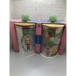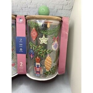 Gourmet Kitchen Eco friendly green canisters. This product is a set of two multicolored glass Christmas jars with lids, designed in a nutcracker theme. The eco-friendly jars are perfect for storing and displaying holiday treats or ornaments. The glass material adds a touch of elegance to any festive decor, making them a collectible item for holiday enthusiasts. The vibrant colors and unique design make these jars a standout addition to any Christmas celebration.