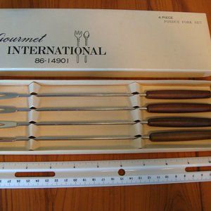 Gourmet International 86-14901 boxed set of 4 fondue fork set. Stainless steel 10 inch with wooden handles and colored plastic tips. Made in Japan. Excellent condition.