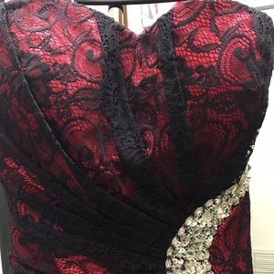 Gorgeous adjustable bust, long red black laced dress (has trail). Medium size fits like a size 6-8