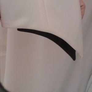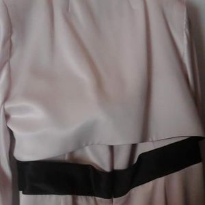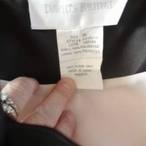 Strapless with bolero jacket. color is oyster with chocolate trim. beautiful on. worn once. excellent condition