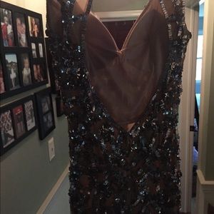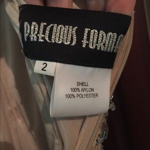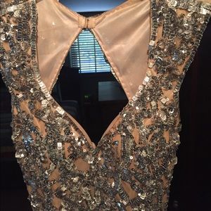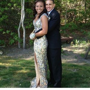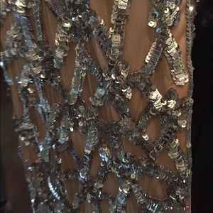 Prom dress or formal event. Worn once. Beautiful beading . Tan and silver. Slit in front leg opening