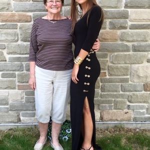 Black quarter sleeved gown with gold chain. I wore it with the chains in the back for a more conservative look, but can be worn both ways! Small piece of stitching in the front is broken, but completely unnoticeable when worn. Other than that in good condition!!