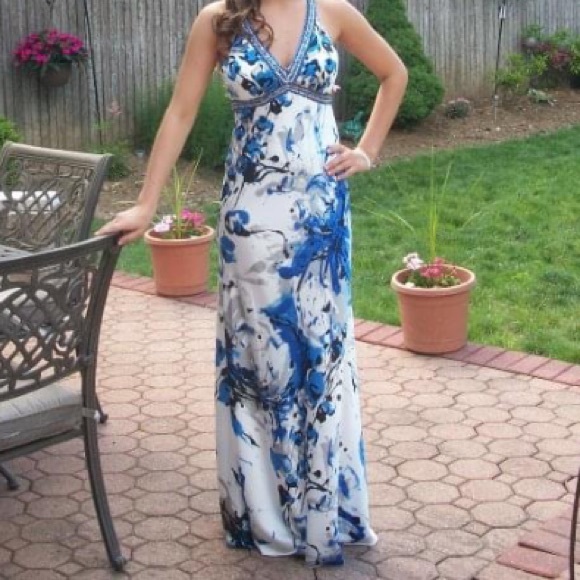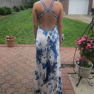 Long dress. Silky feeling. Open front with beads. Back straps connect and your back is all open. absolutely beautiful for any occasion. Worn only once for a few hours. Perfect condition.