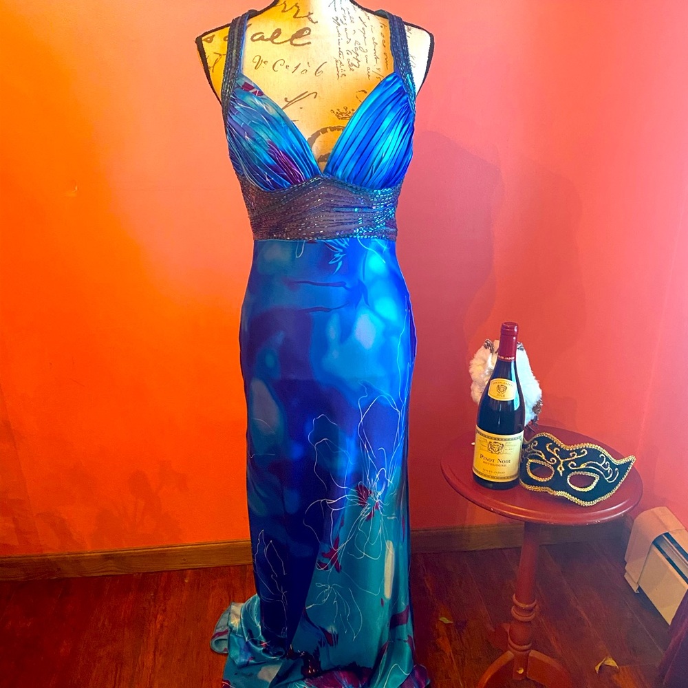 cachet - evening gown-mediterranean and Caribbean shades of blue sexy décolletage-Beautiful beading - fit and flares- Low back long train- polyester charmeuse-size 10 fits 8-10