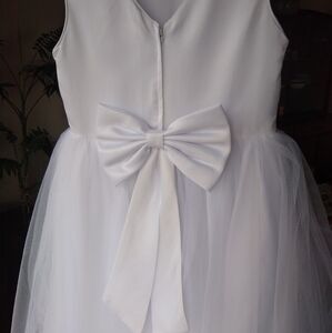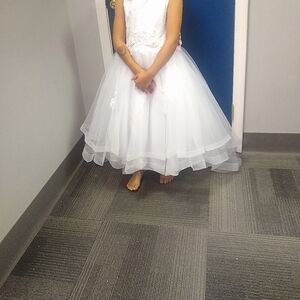Sleeveless gown that was purchased in 2023 at a local gown boutique. worn only once by a flower girl at church but would be a perfect First Communion dress as well. It's absolutely gorgeous and very white, with a train, satin body with three layers of tule on the skirt with embroidered motifs. shimmering, beaded bodice.