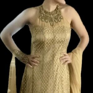 This is a beautiful custom made gown size 2/4. It was designed and worn only once for a pre-wedding event. The detail is very elegant and hand stitched. This is good for someone who is between 5'4 - 5"6 with or without a heel. The model is 5'4 with 2.5 inch heel. This dress has not imperfects or damage. Like new condition. Great for a prom, wedding event or any formal event.
