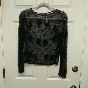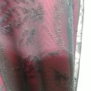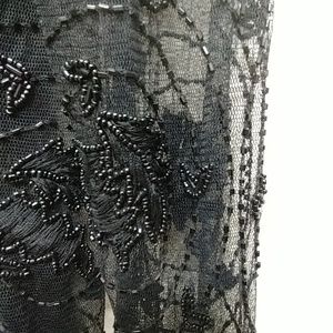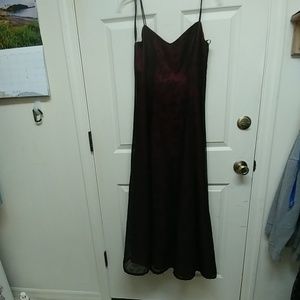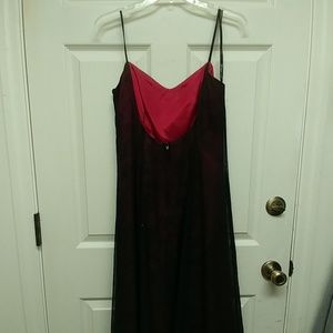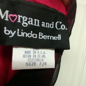 Whoa...can't believe I once fit into this but I did. My loss, your gain on this beautiful dress that can be worn with the stunning black top. Spaghetti straps on gown. Lined with red fabick. Morgan and Co. 53 inches long from top of straps to bottom of gown. Sleeves on beaded top are 25 inches long. Gorgeous! Tuille in lining for puffy bottom. Made in USA. Polyester. This is a junior size 7/8 petite.
