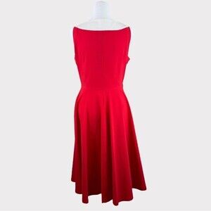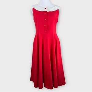 What a cute retro dress. This dress has plenty of stretch and is a bright, beautiful red color. It has a wide band collar and is sleeveless. It is a fit and flare dress.