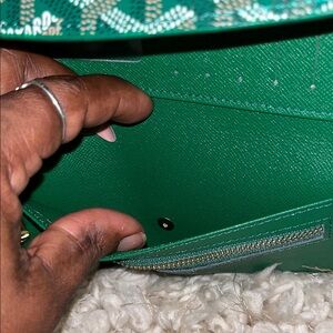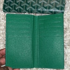 Elegant Goyard wallet set in green and black. Features signature pattern. Ideal for stylish organization.