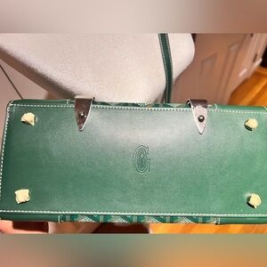 Chic Goyard satchel in green and yellow. Features a stylish design with a sturdy handle.