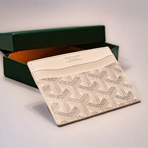This Goyard Saint Sulpice Card Holder is a must-have for anyone looking for a stylish and practical accessory. The wallet is made of high-quality materials and features a sleek ivory/gray color that complements any outfit. Its compact size makes it easy to fit into any pocket, while the numerous card slots provide ample storage for all your essential cards.