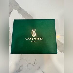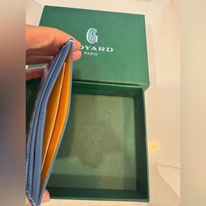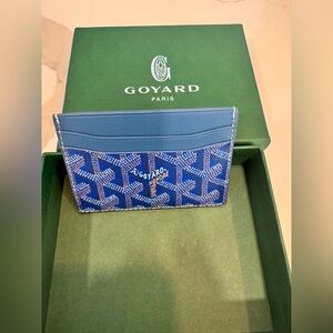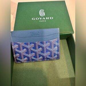 Elegant Goyard card holder in blue. Features iconic pattern with white accents.
