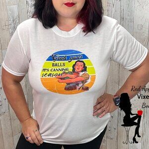 Calling all canning queens! Get ready for canning season in style with this vintage-inspired Grab Your Balls Graphic Tee. Featuring a delightful lady hauling her BALLs of canned goodness, you'll be sure to grab attention (and lots of laughter) wherever you go. So show it off proudly...it's time to get your can on!