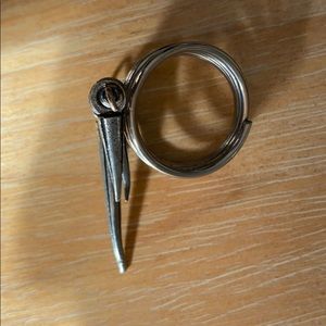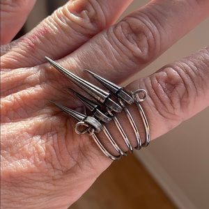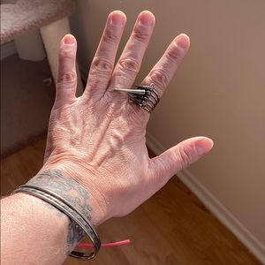Button one, Bambi, button two, Portland carpet (google it’s a thing), three a vintage lapel pin. Silver tone bangle bracelets and spike statement ring. I wore these a lot to rock shows and concerts in town. Throw the buttons on a Jean jacket (for sale below) a ring and some bracelets and your good to go.