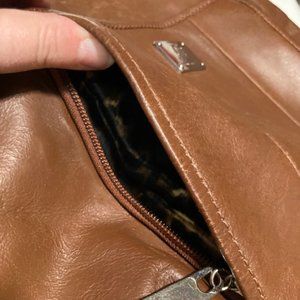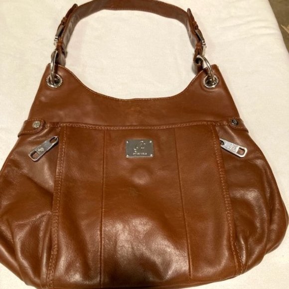 Grace Adele Brown Leather Hobo Style Designer Handbag. If you love handbags with zippers, this is the bag for you!!!! This bag is made of real leather and still has the 'real leather' smell to it. It's roomy, but not too large.