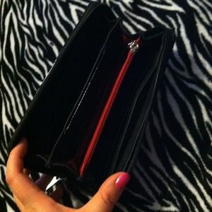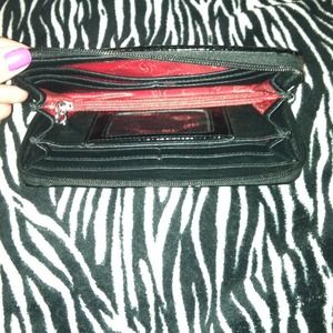 Measurements : 7.5"L 4"H faux leather 2 full length pockets 1 Id slot and 8 card slots. Perfect condition ! Matching bag available!!