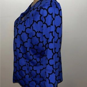 Stylish women's top featuring a bold blue and black pattern. Perfect for adding a pop of color to your wardrobe.