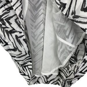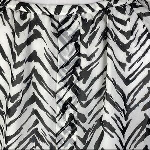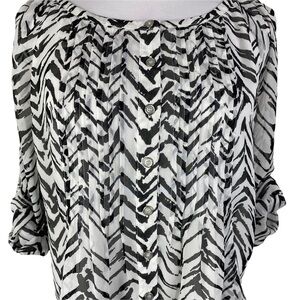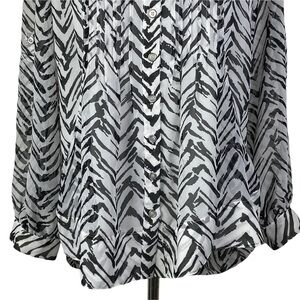 Grace Elements Women's Medium Black White Chevron Striped Hi-Low Roll Tab Long Sleeve Button Down Blouse. Front pleats, button cuff and 2 front pockets. The body of the blouse is lined and the sleeves are sheer. Great Condition. No rips, flaws, or stains. Smoke free home.