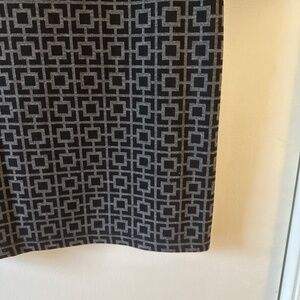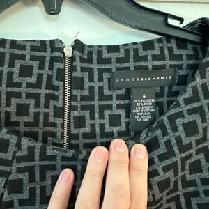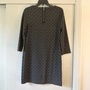 Grace Elements geometric printed dress in gray and black. 3/4 length sleeves, round neckline, back zipper closure. Excellent office wear.
