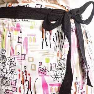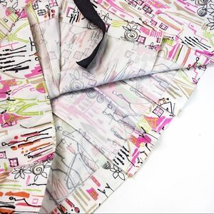 Really awesome pattern of abstract stick figures in a cityscape in pink, apricot, tan, lime green, and black on a white, box pleated A-line skirt by Grace Elements. Includes black grosgrain ribbon belt tie.