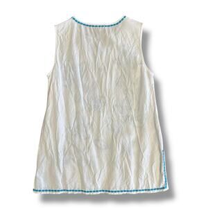Elegant and timeless sleeveless tunic from Grace Elements, featuring turquoise blue floral embroidery on crisp white linen-blend fabric. Split neckline, side vents, and lightweight material create an effortless, polished look. Perfect for warm weather, resort wear, or casual days with jeans or linen trousers.